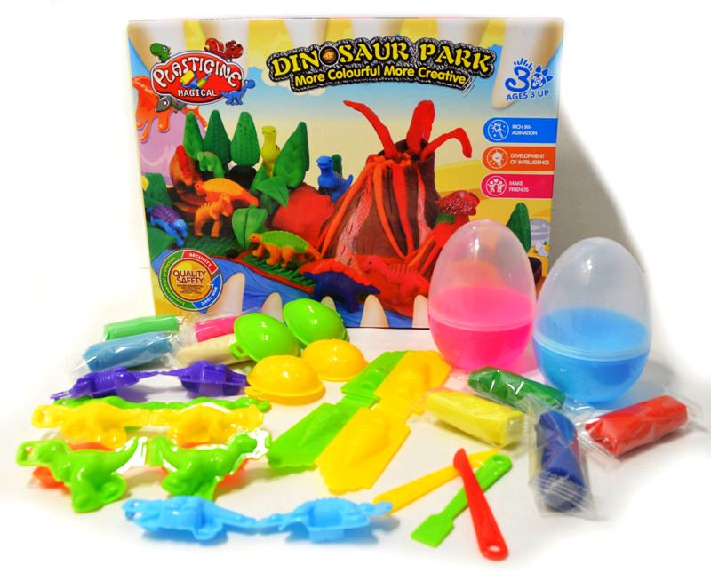 • Быстросохнущий пластилин для лепки динозавров. Получив в подарок такой набор, ребенок сможет окунуться в древний мир доисторических существ. В такой набор входят: специальный пластилин ярких расцветок, игровое поле с морем и большим вулканом, формочки для лепки динозавров, пластмассовый ножик.