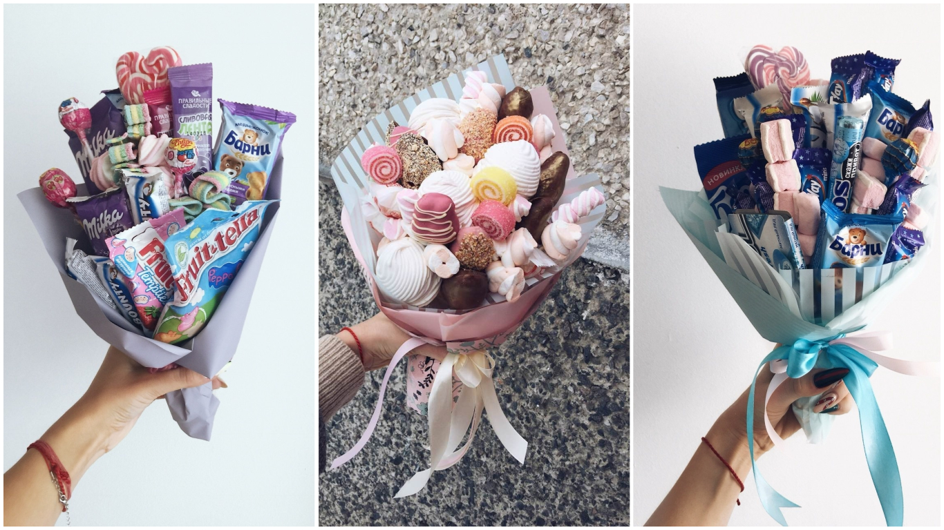 - букет из жвачек, конфет, который можно собрать своими руками;