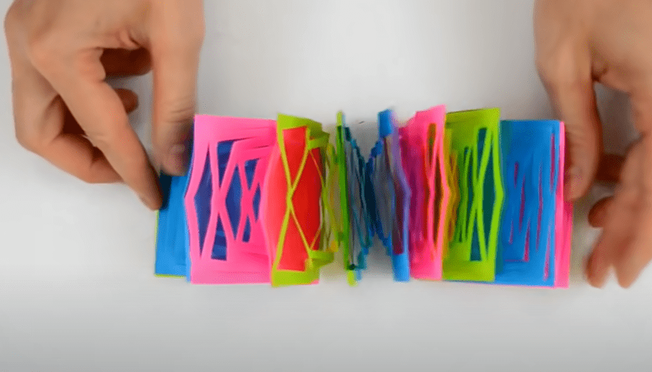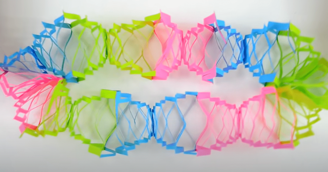 - Заготовку разворачиваем. Степлером соединяем края полученных полосок. Начинаем с самых маленьких.