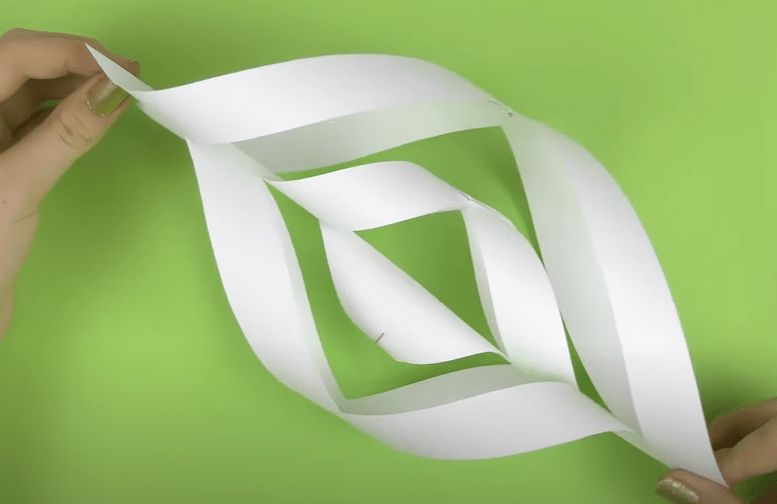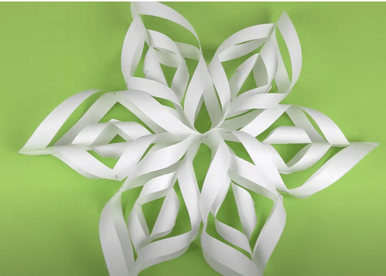 - После фигуру переворачиваем, скрепляем края следующих полос и таким образом собираем первый лучик для снежинки.