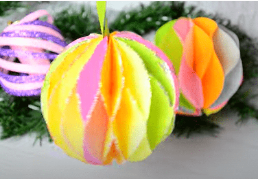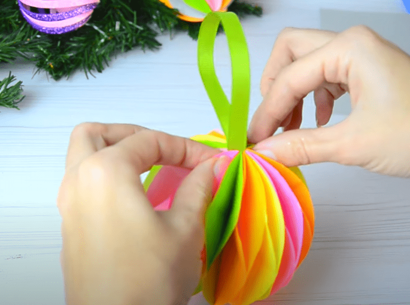 - Шарик раскрываем и склеиваем его две последние стороны. В середину вставляем петельку из атласной ленты и приклеиваем.