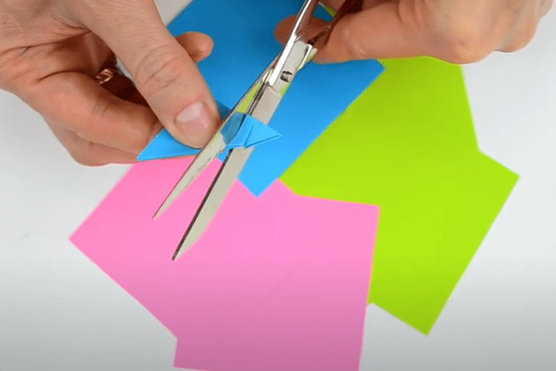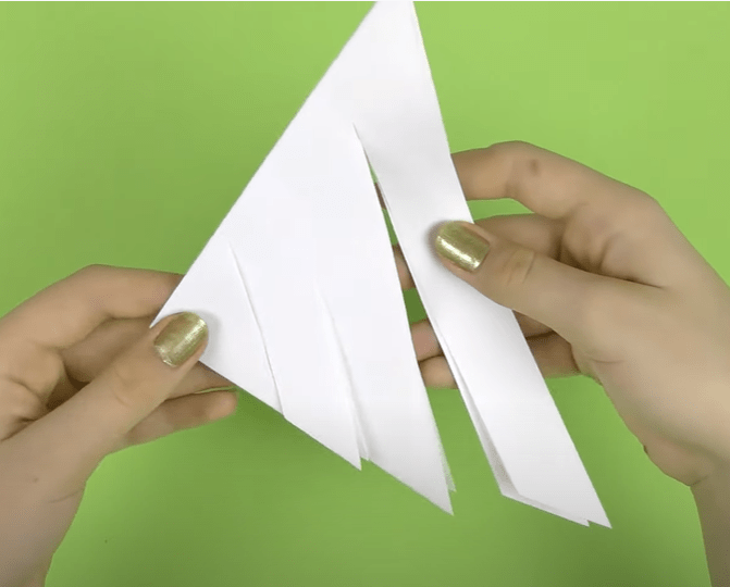 - От сведенных углов к линии сгиба параллельно самой длинной стороне делаем три разрезы. Ширина полос – 2 см.