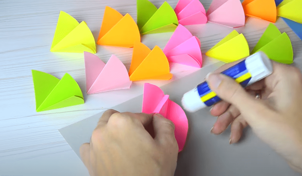 - Из цветной бумаги вырезаем квадраты любого размера. Каждый складываем треугольником, а затем соединяем вместе дальние углы.
