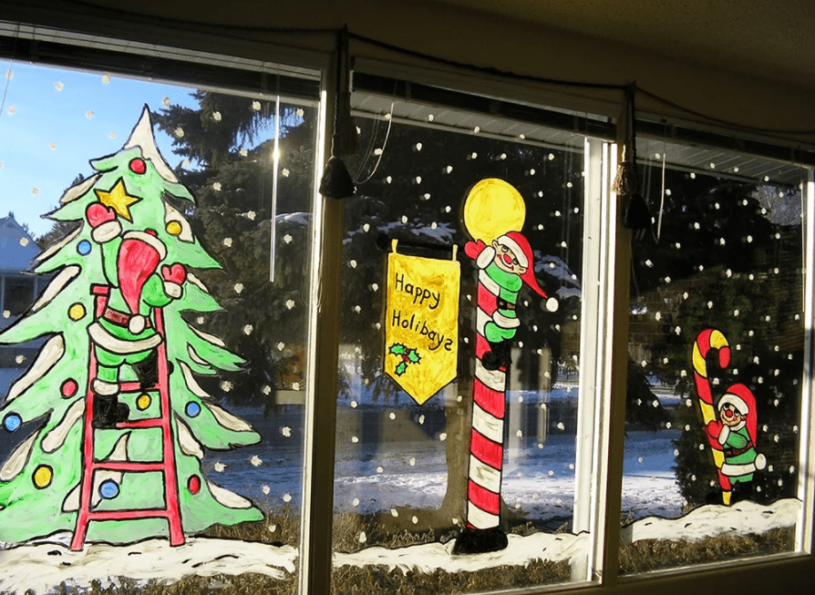- При помощи красок можно красиво украсить окна — широкая поверхность стекол позволит изобразить целые сюжеты новогодних сказок. И необязательно приглашать учителя рисования, а можно просто распечатать рисунок, закрепить с обратной стороны, обвести контуры и разукрасить.