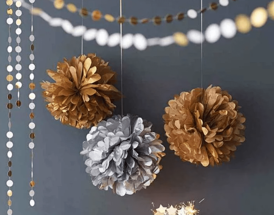 Идей для украшения потолка также много. Можно купить готовый декор из цветной бумаги (продается в сложенном виде). Его достаточно развернуть, и получатся красивые объемные фигурки. Кстати, очень ярко смотрятся помпоны из гофрированной бумаги. Сделать их очень просто:
