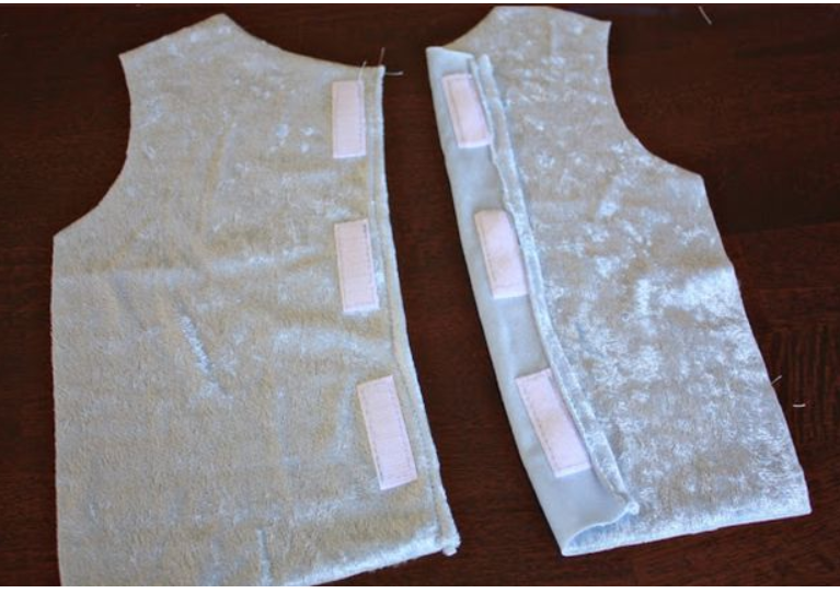 - На спинку пришиваем застежку и, измерив окружность плеча, вырезаем манжеты.