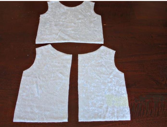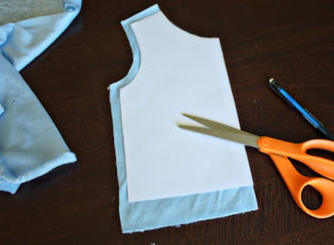 - На ткань переносим детали спинки. На горловине добавляем высоту, вырезаем.