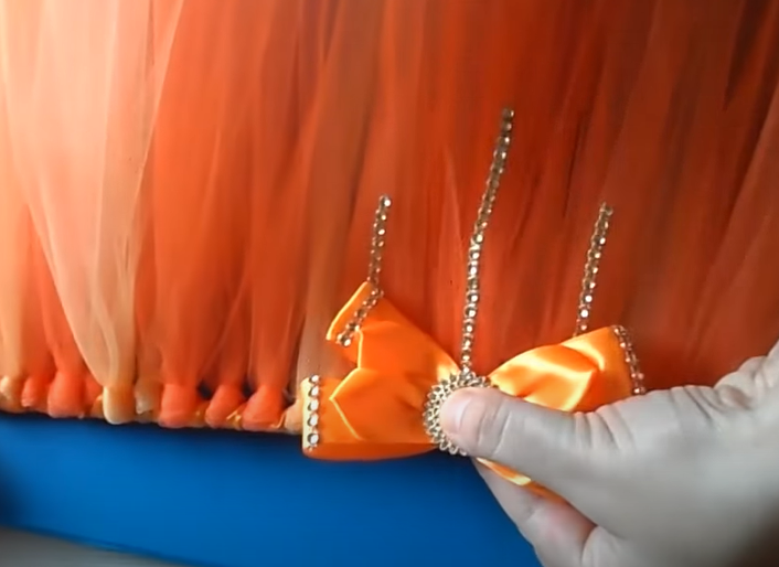 - Когда передняя часть юбки будет готова, переходим к хвостику. Для этого берем неиспользованный фатин.