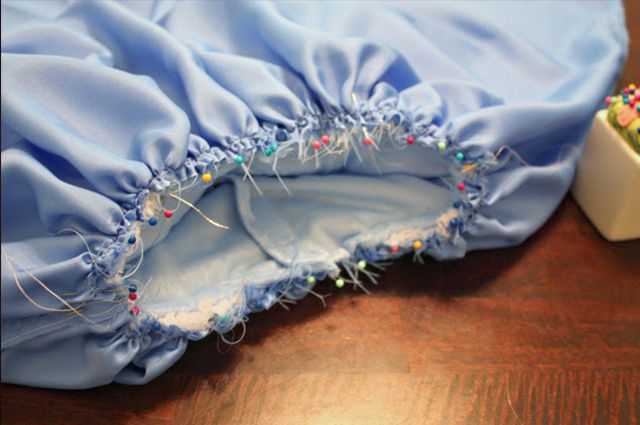 - По линии сгиба пришиваем фалды к лифу, немного собрав ткань на талии, справа и слева.