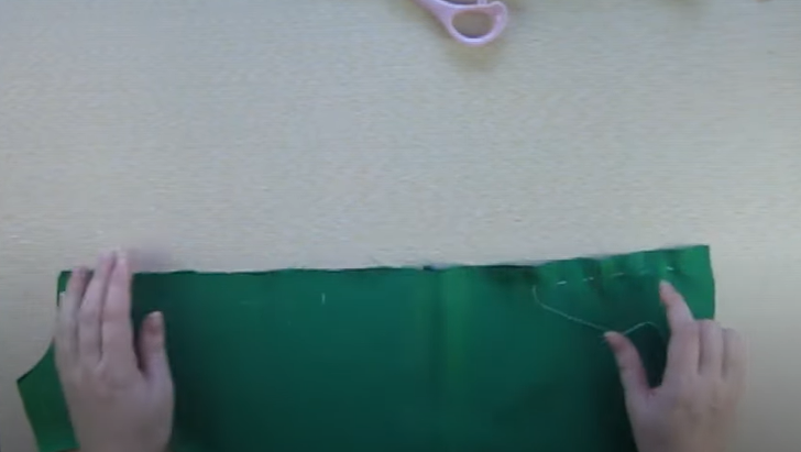 - Для костюма берем атласную ткань зеленого цвета, переносим выкройку передней части платья. От линии делаем отступ в 0,5 см и вырезаем.