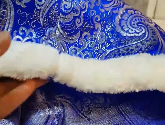 - Осталось только украсить мехом. Для этого берем меховую полоску шириной 7,5 см, но если ширина больше, то можно вырезать две полоски, а затем их сшить между собой.