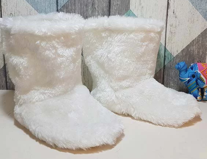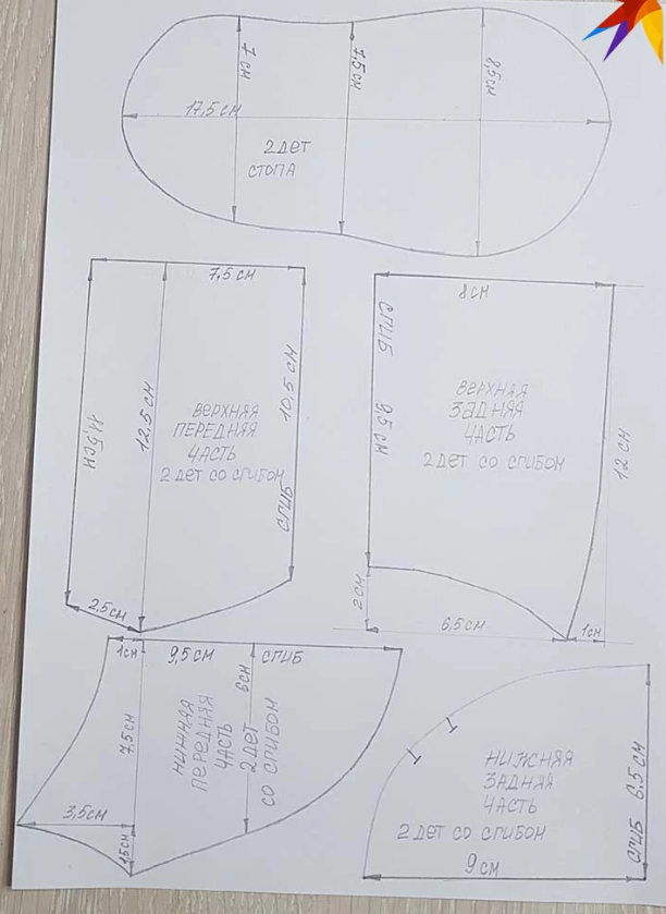 - По выкройкам вырезаем все указанные детали из меха. Для подошвы можно взять искусственную кожу, любую белую ткань и тот же мех. Нужно обратить внимание, что у меха есть направлением ворса, вот по этому направлению и кроим.