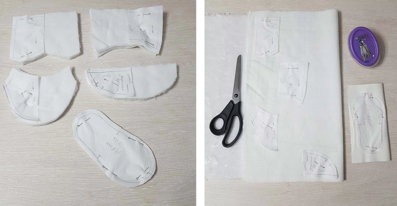 - На швы оставляем припуски и вырезаем все детали из ткани по бумажным выкройкам.
