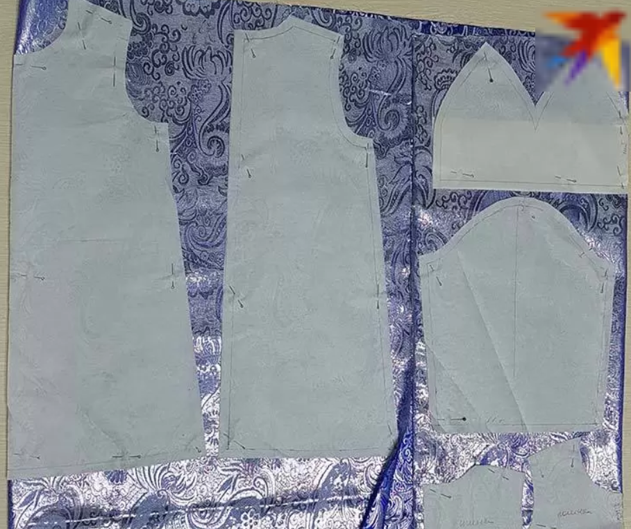 - Начинаем шить костюм на Новый 2021 год с тулупа. Для этого из бумаги вырезаем выкройки и раскладываем на ткани. Можно взять парчу или любую другую ткань средней плотности.
