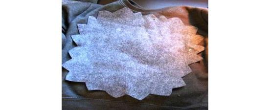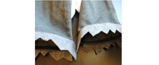 • Берем толстовку или кофту от пижамы и отмеряем ширину и длину передней полочки. Раскладываем кусок серого войлока, рисуем овал по заданным меркам. Вырезаем деталь и делаем по краям острые зубцы по ее периметру. Прикладываем овал к кофте и пристрачиваем его на машинке.