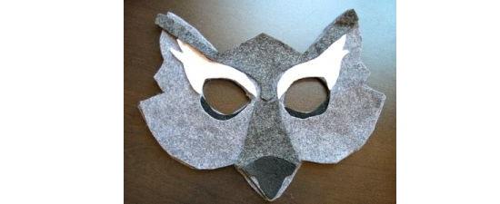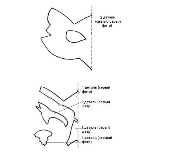 • Из темно-серого войлока делаем нос, а из белого – брови. Пришиваем вручную или приклеиваем элементы на лицевую часть маски. При помощи кусочка черного войлока оформляем кончик носа. Сшиваем обе части маски, пристрочив по бокам резинку. Костюм готов!