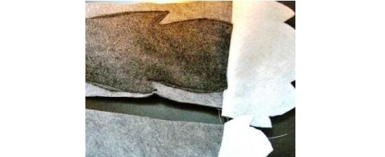 • Отрезаем от серого войлока два прямоугольника с шириной 15 см и длиной 40 см. Вырезаем еще один кусок из темного войлока – 10 на 30 см. Нарезаем зубцы по бокам, чтобы было похоже на шерсть. Подготавливаем также кусок из белого войлока, чтобы оформить кончик хвоста.