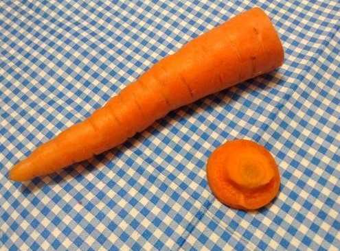 •          Сверху срезаем полоски моркови, добиваясь получения меньшего диаметра. Вот у нас и получилась «шляпка»