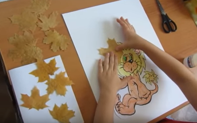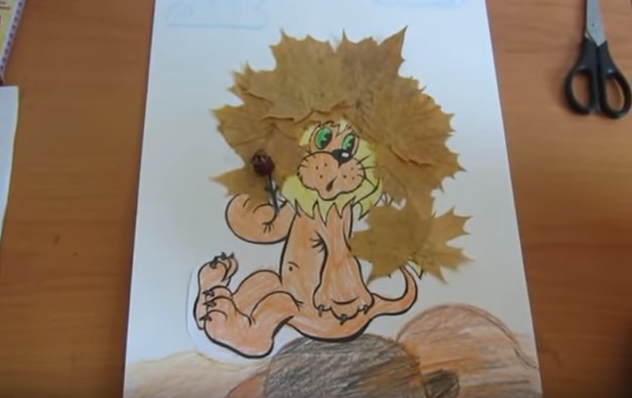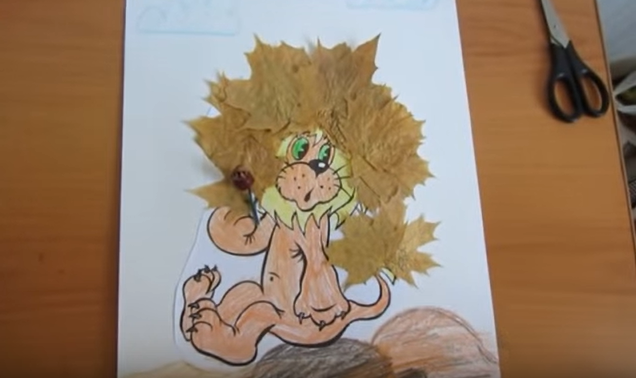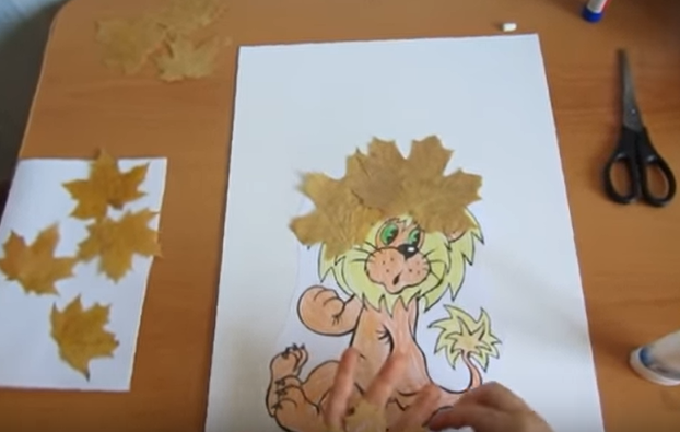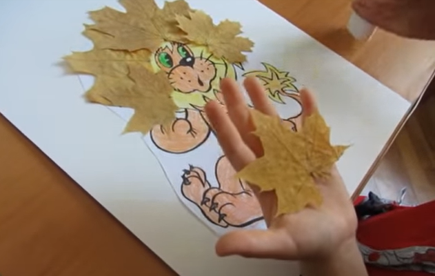 •          Промазываем листья клеем и приклеиваем по месту. Например, можно выполнить гриву львенка очень пышной и эффектной.