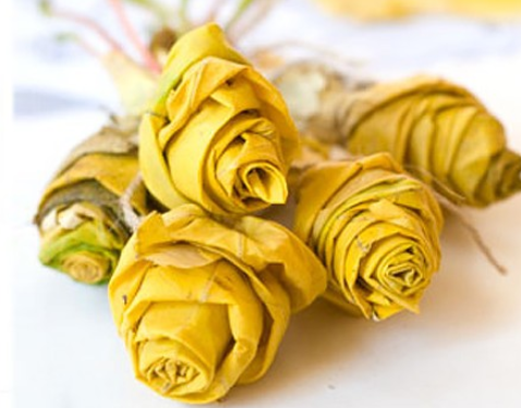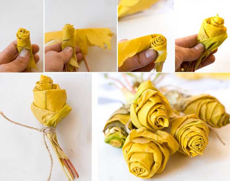 •          Получив желаемый результат, связываем всю конструкцию снизу прочной ниткой или тонкой веревкой. Складываем все «розочки» в один букет, по его краям распределяем целые листья, завязываем красивую ленту или тесьму.