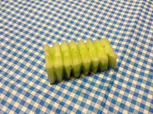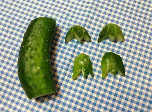 •          С огурца меньшего по размеру также срезаем кончик, он нам не понадобится. Оставшуюся часть огурца разрезаем снизу пополам, не дорезая его полностью. Все полученные детали протыкаем зубочисткой, скрепляя их в одну конструкцию – голову крокодила.