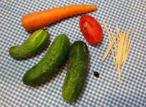 •          Также зубочистками прикрепляем «глазки», вырезанные предварительно из мякоти огурца и кусочков черных оливок.