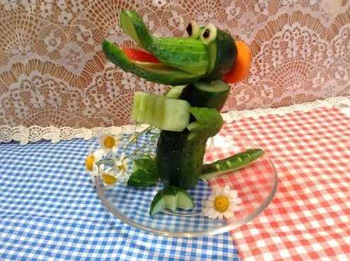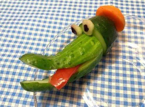 •          «Язык» вырезаем из помидора, также прикрепляем его по месту зубочисткой. Голову крокодила прикрепляем к «туловищу» из слегка согнутого огурца.