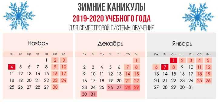 В учреждениях, работающих по системе семестров, классическому варианту учебного года, он разделен на 2 части, каждая из которых делится еще по четвертям. При таком варианте ученики и их родители ориентируются на график каникул, в котором для зимнего отдыха отводятся конкретные дни – с 26.12.19. по 11.01.20., общее число получается 15 дней. Новая четверть начинается в четверг, 09.01.20.