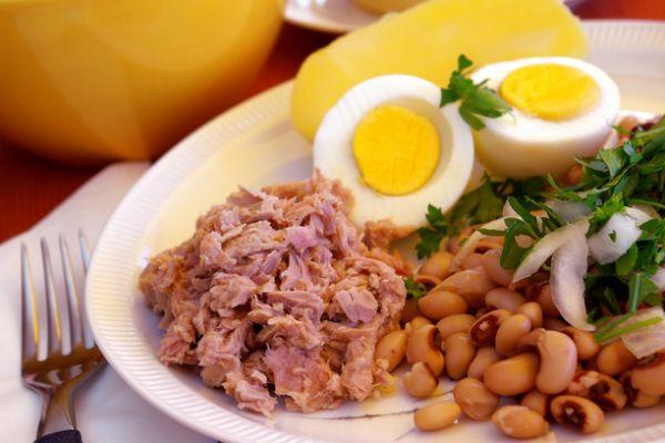1 банка консервированного тунца в собственном соку, 200 г отварных овощей, 2 огурца, 2 помидора, 1 ст ложка зерненого творога, 1 тост, 1 грейпфрут.