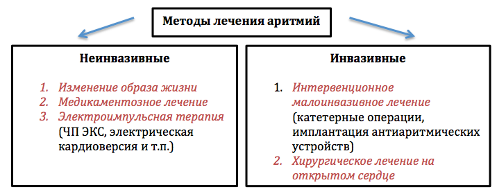 Существует хирургические метод лечения аритмий: катетерная абляция участка миокарда, в котором возникает патологическое возбуждение. Однако этот метод показан не всегда.