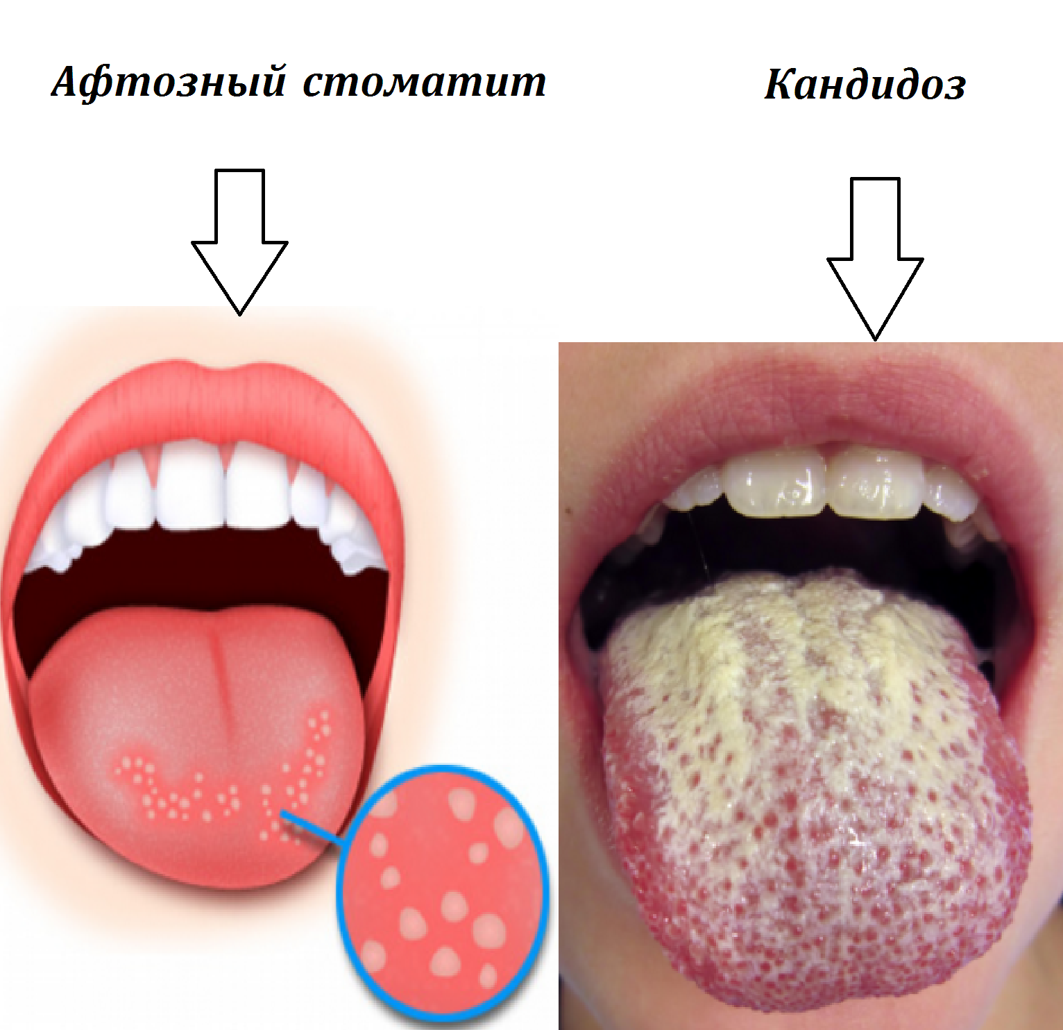 Самыми частыми факторами образования белесых плотных налипаний являются заболевания – кандидоз, глоссит, стоматит. Заболевание кандидозом сопровождается появлением по всему рту, миндалинам, задней стенке гортани белесых масс, где селятся грибки, бактериальные агенты. Это случается при снижении естественной защиты, при развитии диабета, после ОРВИ.
