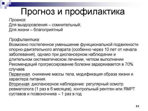Среди многочисленных прогностических факторов, то есть тех, которые говорят о течении заболевания, наихудший прогноз имеет следующий вариант: ранний возраст начала заболевания (до 16 лет), выраженное воспаление, быстрое прогрессирование изменений, плохая реакция на нестероидные противовоспалительные препараты, поражение тазобедренного сустава и наличие внепозвоночных проявлений.
