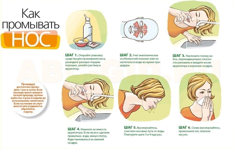 Если вы страдаете гайморитом, тогда ирригация проводится по-другому. Склонитесь над ванной, зажмите пальцем любую ноздрю, приоткройте рот и втяните свободной ноздрей подготовленный раствор. После того как он выльется через рот, повторите манипуляцию со вторым носовым проходом.