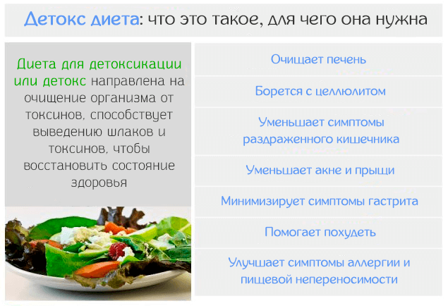Диеты детокс-программ нацелены на очищение крови, выведение токсинов и шлаков. Детокс программы для очищения организма разработаны для кратковременного выведения из рациона некоторых продуктов, что помогает вывести токсины.