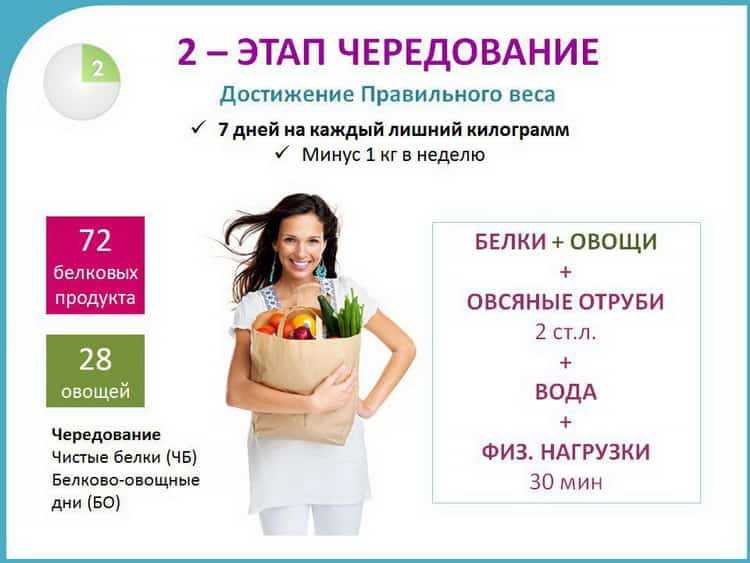 Второй этап считается достаточно щадящим по сравнению с первым, его легче придерживаться, так как, помимо разрешенных белковых продуктов, в список можно включить и овощи.