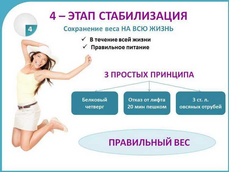 Этот этап считается самым долгим, так как он нацелен на закрепление достигнутого результата. Придерживаться его следует из расчета: 1 потерянный килограмм – 10 дней. То есть если у вас получилось добиться результата -20 килограммов, то закреплять результат придется 200 дней.