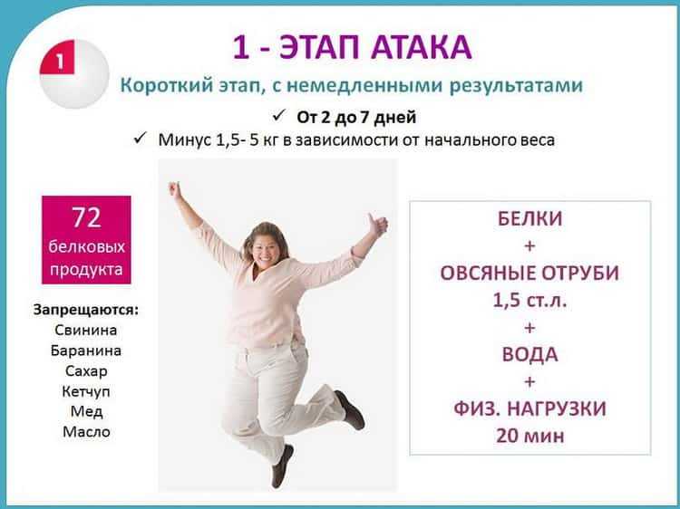 На данном этапе следует обозначить четкие цели потери килограммов. Если за весь период вам нужно избавиться от менее чем 4,5 кг, то достаточно на данном этапе провести 2 дня, если до 9 кг, то 3 дня, до 18 – 5 дней, от 18 и выше – неделю или максимум 10 дней. Более 10 дней придерживаться этапа «Атака» запрещается.