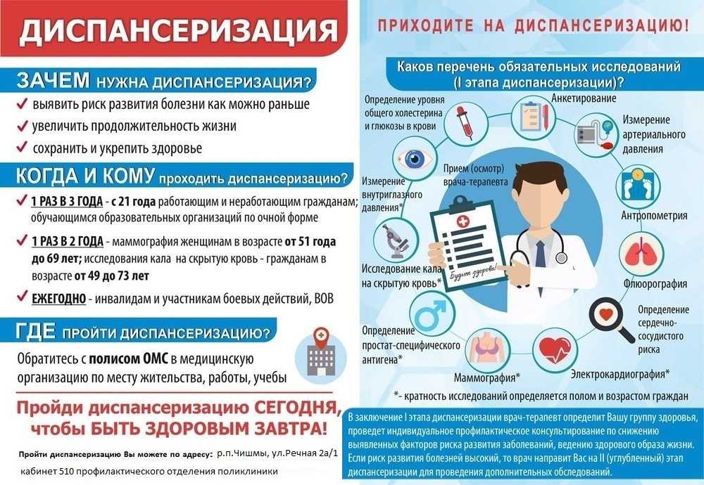 Проводится диспансеризация один раз в три года, а после достижения 40 лет можно ежегодно посещать поликлинику для прохождения обследования. При необходимости проводятся мероприятия в два этапа.