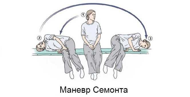Эффективным считается маневр Семонта – больной в сидячем положении поворачивает голову в здоровую сторону, затем ложится на больную, и запрокидывает ее.