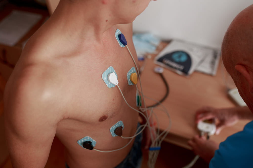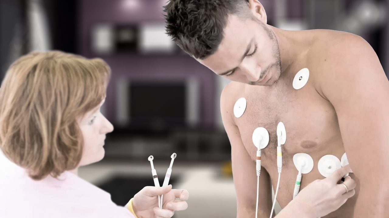 Каждый электрод проводами крепится к считывающему устройству на батарейках, как видно на фото. Оно записывает электрическую сердечную активность и сохраняет данные во встроенной памяти.