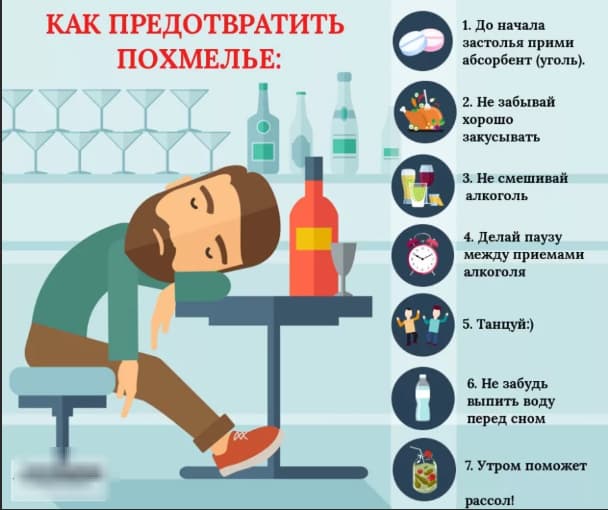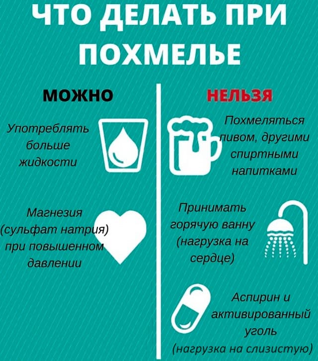 Запрещено снимать похмельный синдром спиртными напитками. Это усугубляет ситуацию отравления, ухудшает имеющиеся симптомы.