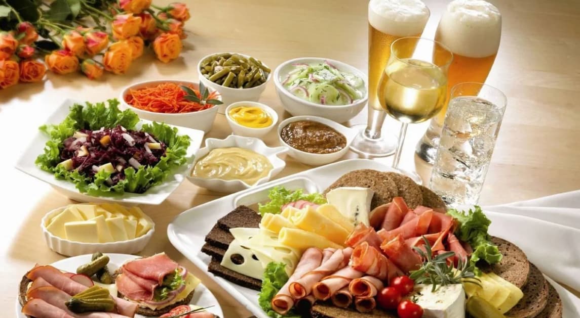 На столе должны быть блюда с высоким составом углеводов, белков, с минимальным содержанием жиров. Сбалансированные закуски предотвратят алкогольное отравление. На столе нужны картофель, рыба, мясо. Между приемом спиртного надо делать небольшой перерыв на закуски, общение, танцы.