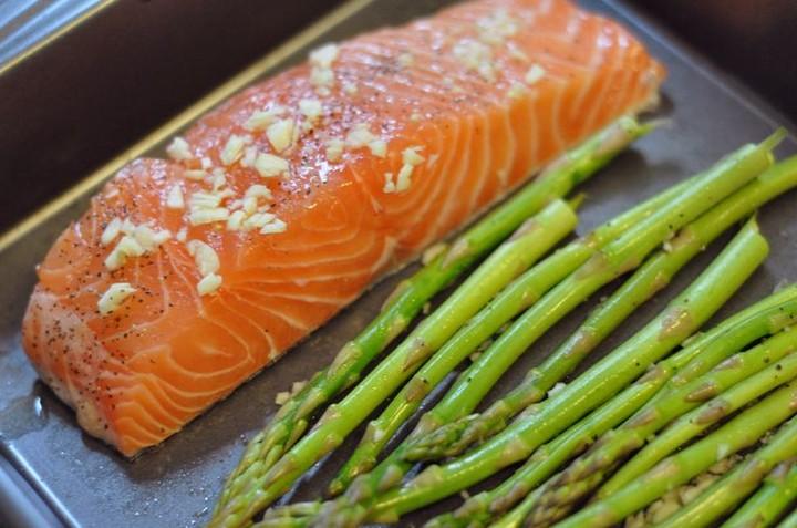 • Духовку следует нагреть до 180 градусов. Противень застелить фольгой. На него выложить рыбу и спаржу. Все поставить в духовку на 20 минут.