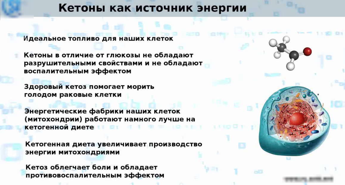 Отказ от сложных углеводов создает для организма стресс, что приводит к выработке кетоновых тел или ацетона. Кетоновые тела уменьшают чувство голода, а организм начинает активно использовать подкожные жировые отложения как источник энергии.