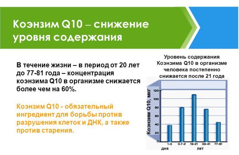 Практическим путем доказано — наибольшее количество Q10 содержится в организме детей и подростков. К 30 годам синтез постепенно снижается, к 40 концентрация уменьшается на 20%. У людей старше 60 лет содержание убихинона не превышает отметки 40% от первоначального показателя.