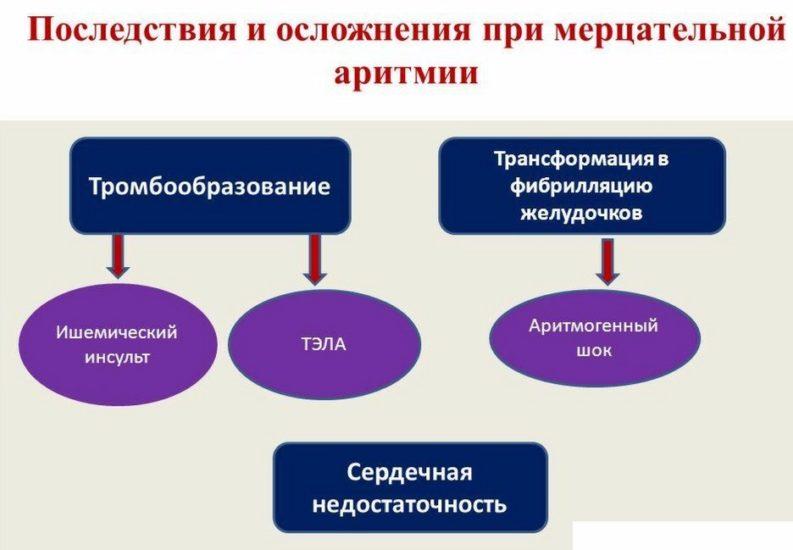 Приступ мерцательной аритмии, который длится очень долго, может привести к образованию тромбов, нередко развивается ишемический инсульт. Постоянные рецидивы заболевания — причина стремительного прогресса хронической формы недостаточного кровообращения.