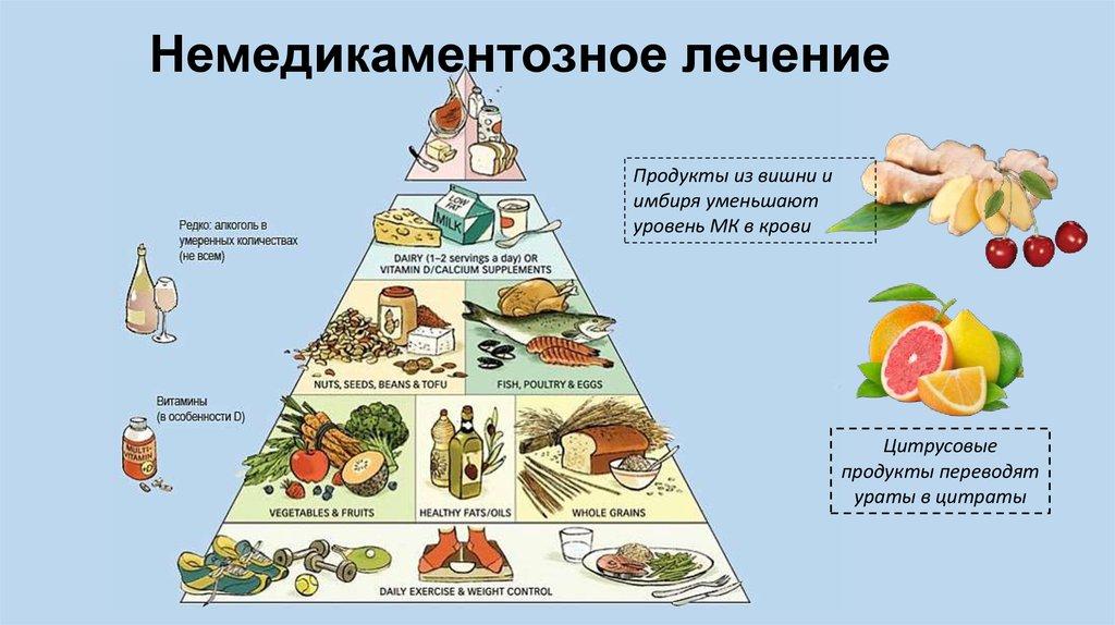 Повышение мочевой кислоты в крови имеет разные причины, проявляется разными симптомами. Но в лечении главное место занимает диета. Увеличивается объем суточной нормы жидкости до 2-2,5 л в сутки, в него включаются первые блюда, соки, кисели, компоты, чаи. Основной объем жидкости – чистая вода. Уменьшается использование соли, острых специй.