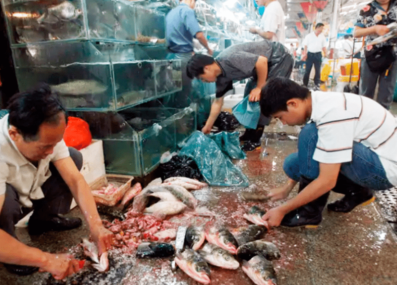 Рынок получил название «мокрый» по той причине, что продавцы льют очень много воды на пол и прилавки, чтобы отмыть кровь, грязь и следы от разрубленных животных. «Мокрый» рынок место полной антисанитарии.