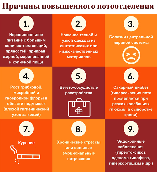 • сильное потоотделение в спине, на ладонях, груди и лице.