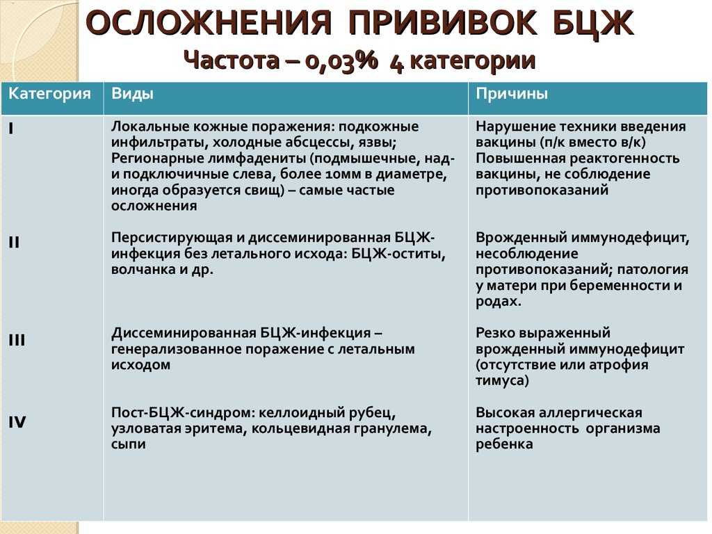 В основном, все эти проблемы вызваны тем, что малыш рождается с каким-либо видом патологии, что приводит к снижению местного иммунитета. Врачи обязаны перед введением БЦЖ обследовать новорожденного и только абсолютно здоровому ребенку сделать прививку.